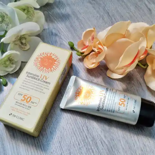 3W Clinic's intensive UV sunblock cream SPF50 PA+++ is a 70ml sunscreen product containing Aloe Vera and Ginseng. To use, wash your face, apply the cream evenly, and reapply every 2-3 hours. It can be used in combination with other sun protection measures, such as wearing a hat and sunglasses.
