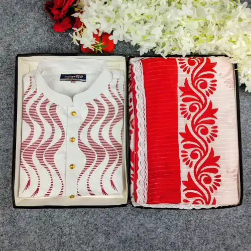 👗 শাড়ি: হাফ সিল্কে স্ক্রিন প্রিন্ট, যা দেবে আভিজাত্যের ছোঁয়া।👕 পাঞ্জাবি: কটন ফ্যাব্রিকে তৈরি, আরামদায়ক এবং স্টাইলিশ।🎨 বিশেষত্ব: লাল-সাদা ম্যাচিং কালার, যা পূজোর আবহকে করে তুলবে আরও উজ্জ্বল ও প্রাণবন্ত।এই সেটটি শুধু পোশাক নয়, বরং আপনাদের একসাথে কাটানো উৎসবের মুহূর্তগুলো