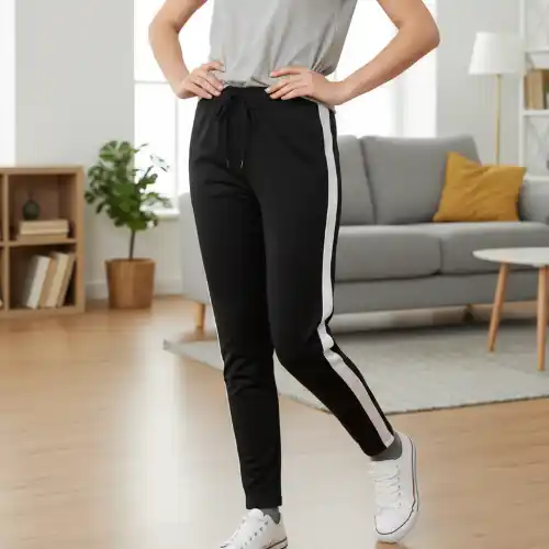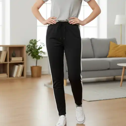 These are black track pants with a white stripe running down the side of each leg. The pants have a drawstring waistband and a tapered fit, making them a popular style for athletic or casual wear. This type of pant is often made from a comfortable and stretchy fabric like cotton or a polyester blend.