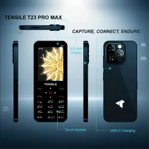Tensile T23 Pro max. 2.8" Big Display. 32 GB Memory Support. Nano Sim Support. Big Speaker and Torch light with Side Key. Mp4/Mp3 Music and MediaTek CPU. HD Camera. Wireless FM Radio, MP4, 3Gp, Mpeg Avi, Rm, Rmvb Availabel. Vibration, Big Torch, Fixed Big Battery. TYPE-C Charging, Auto Call Record, MediaTek CHIPSE