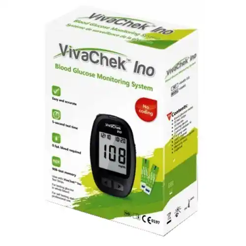 Description: The Vivachek Ino blood glucose meter is a device for controlling blood glucose that gives results within 5 seconds of applying 0.5 μl of a blood sample. It has a memory capacity of up to 900 results and shuts down automatically after 2 minutes of operation.