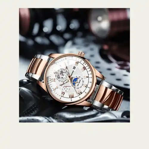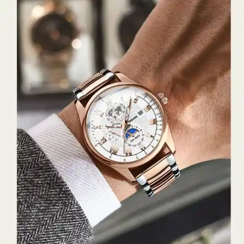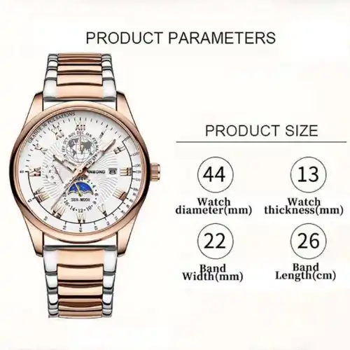 লুমিনাস হ্যান্ডস*: কম আলোতেও স্পষ্ট সময় দেখা যায়। মুন ফেজ & সপ্তাহ প্রদর্শন*: সময়ের সাথে তারিখ ও সপ্তাহ দেখুন। দৃঢ় স্টেইনলেস স্টিল কেস*: দীর্ঘস্থায়ী এবং স্টাইলিশ।